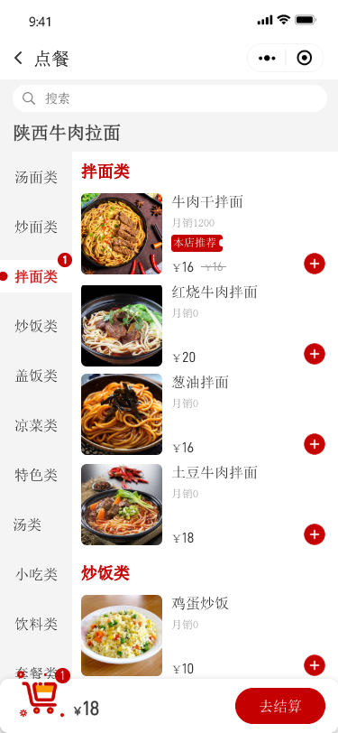 4、下方左邊是食物的分類,右邊是食物展示,點擊不同分類,右邊會展示不同食物,點擊食物右下角的加號,可以打開彈窗選擇口味然后加入購物車,選好食物后在點擊結算按鈕,即跳到支付頁面。