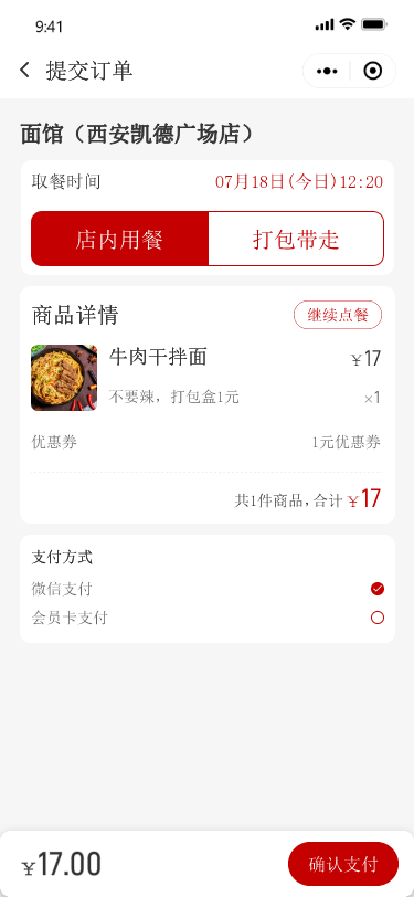 2、緊接著展示取餐的時間和選擇店內(nèi)用餐和打包帶走的按鈕;